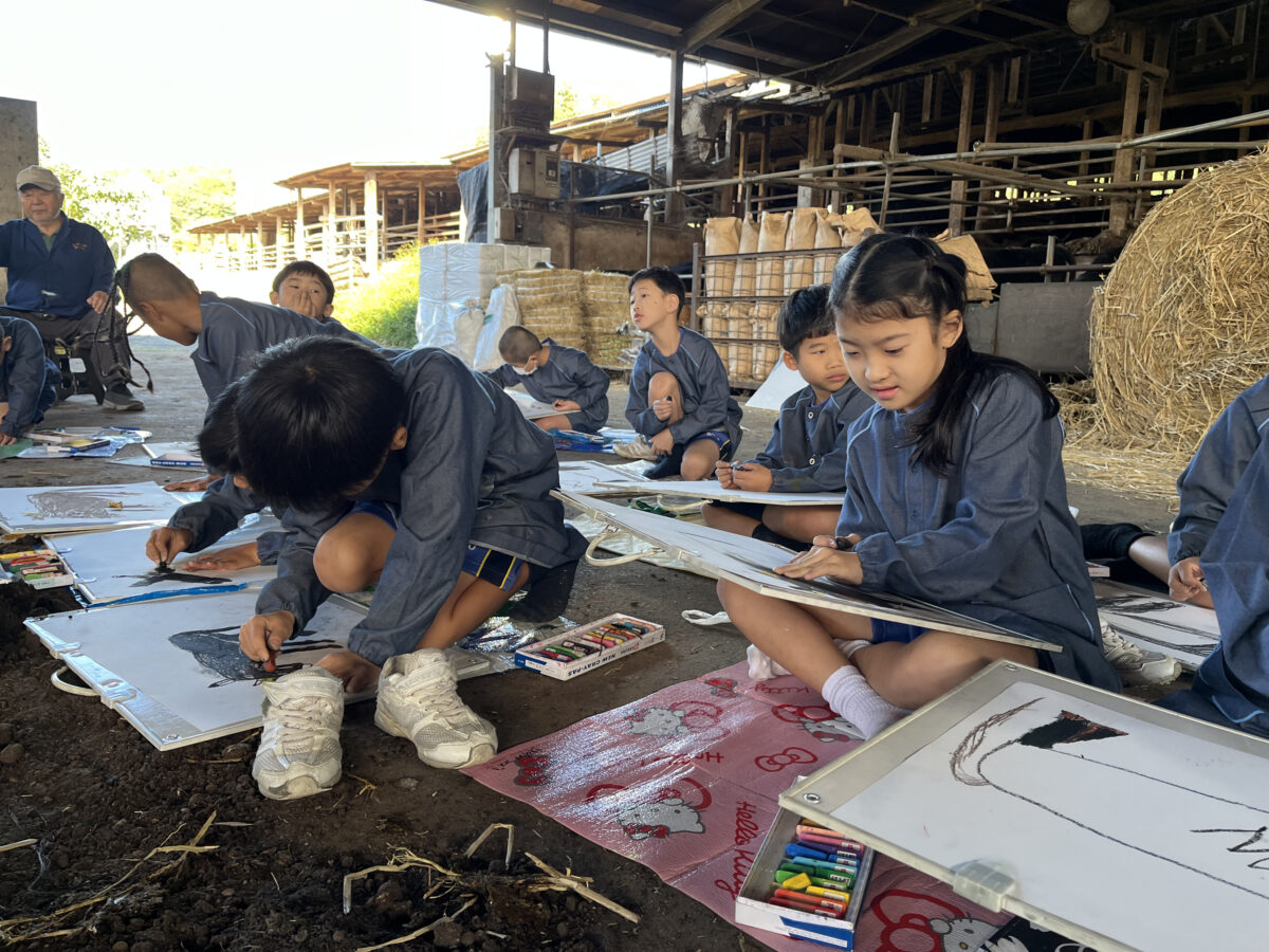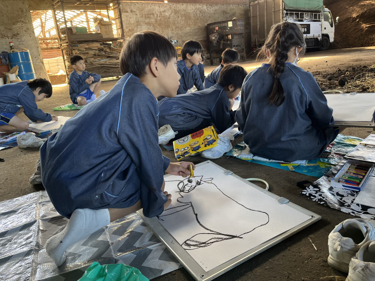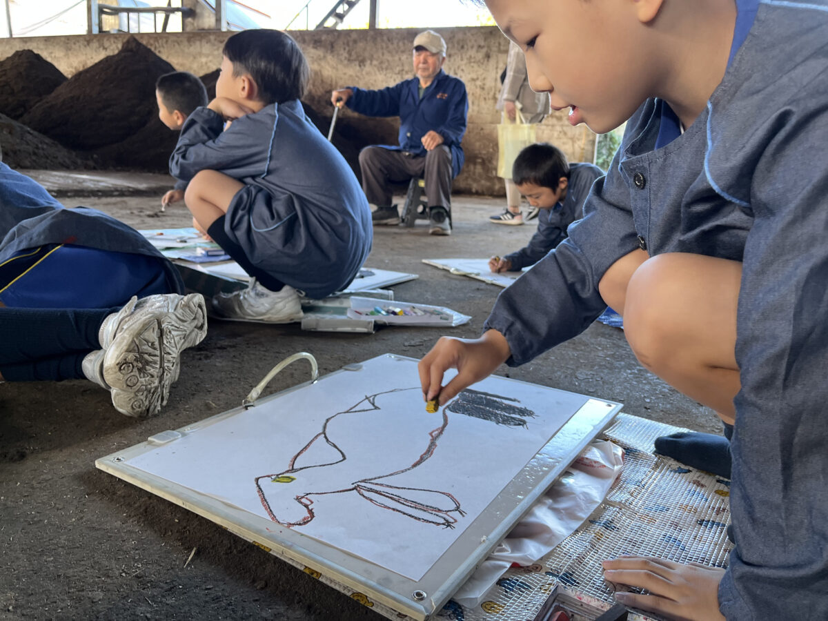 質問タイムのあとは、みんなで牛さんを囲んでクレパススケッチです。
