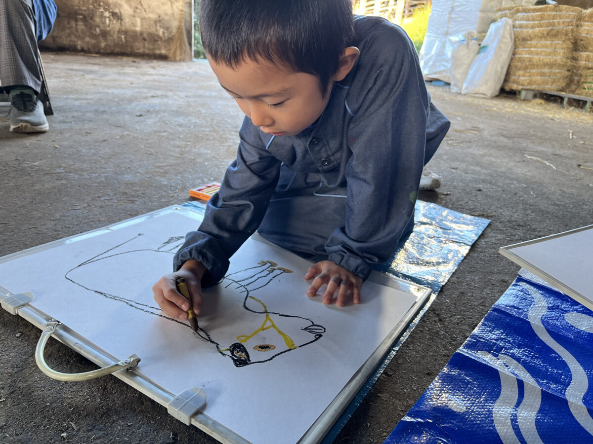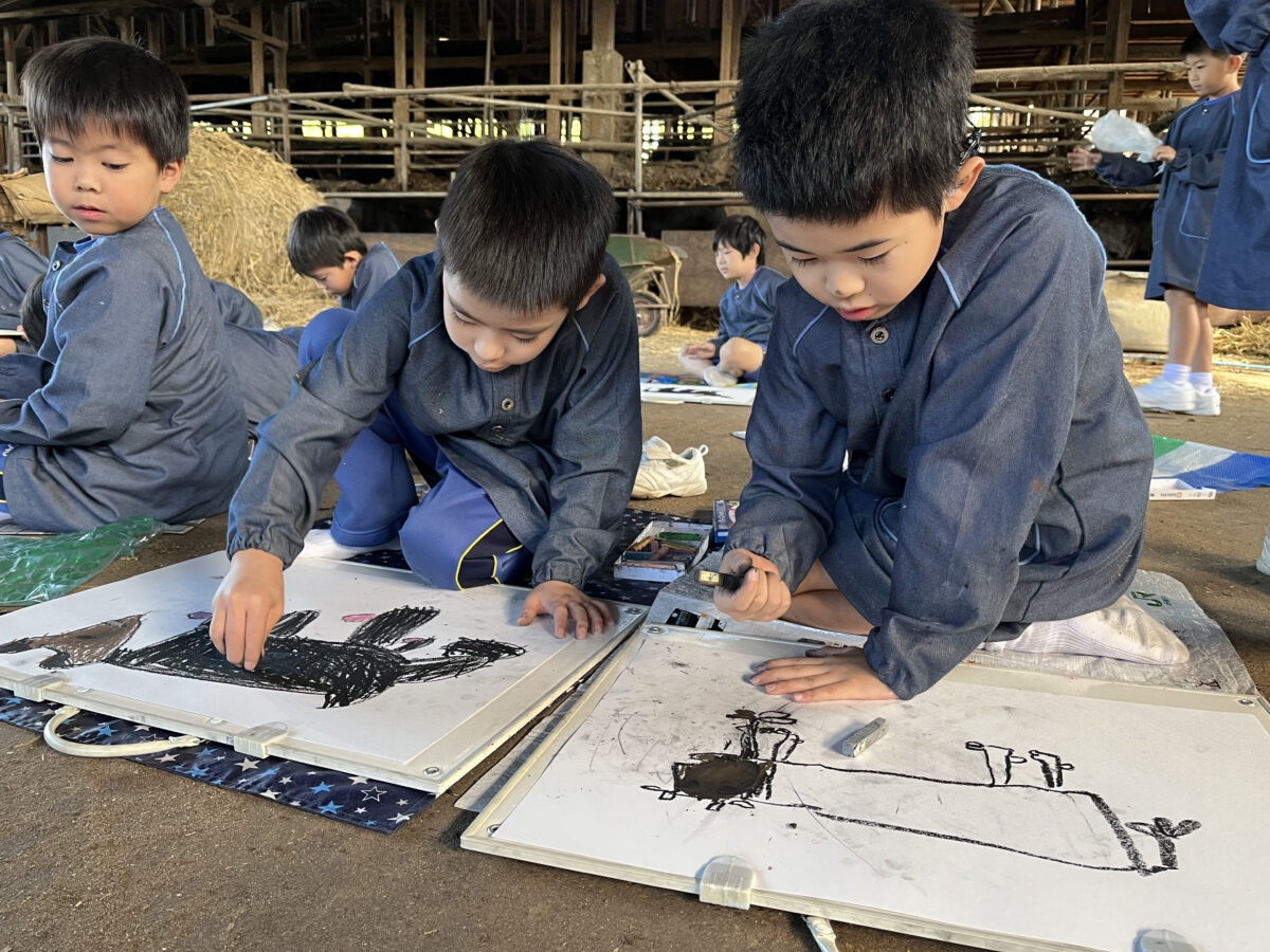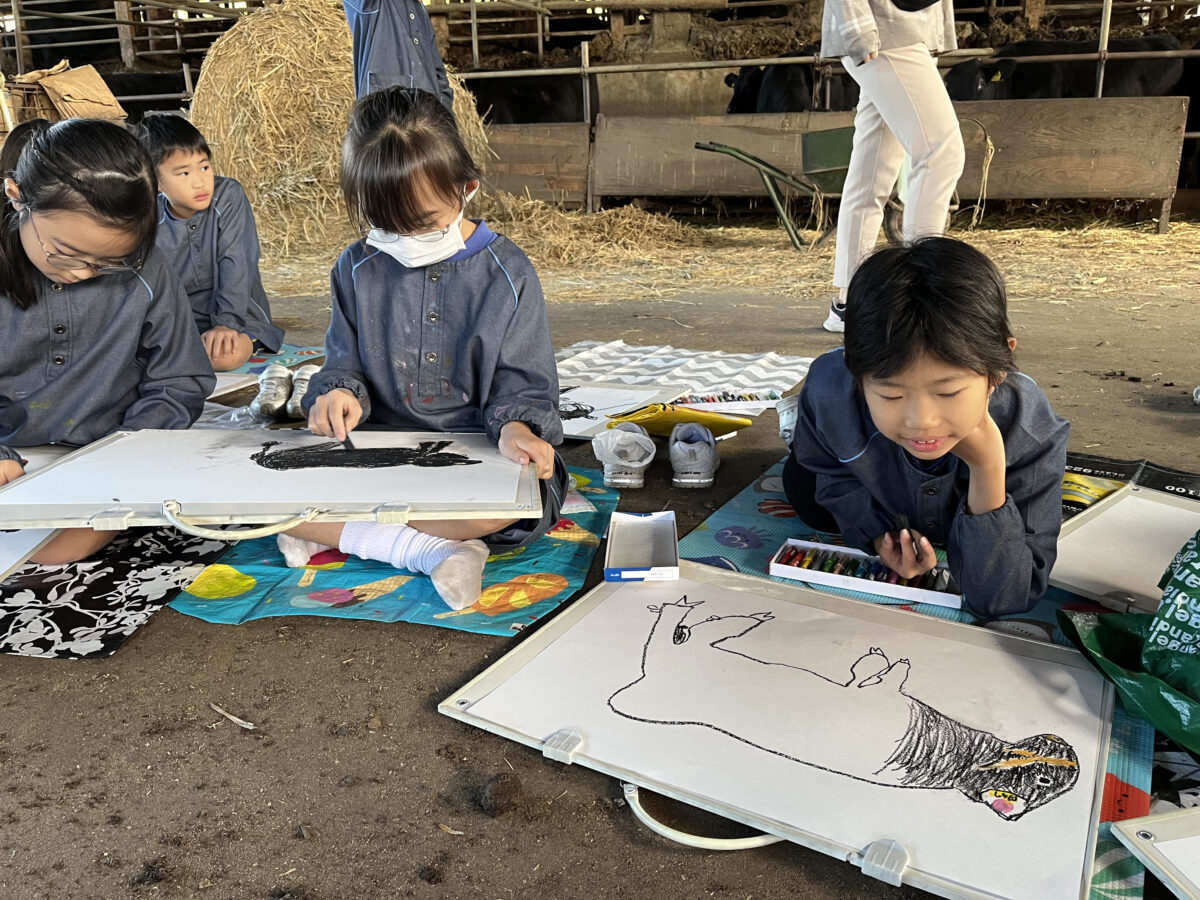 牛さんの身体つきの特徴をよく見て描きます。ヒヅメとケヅメの形や耳標の番号など細部にこだわって描き込む子もいましたね。